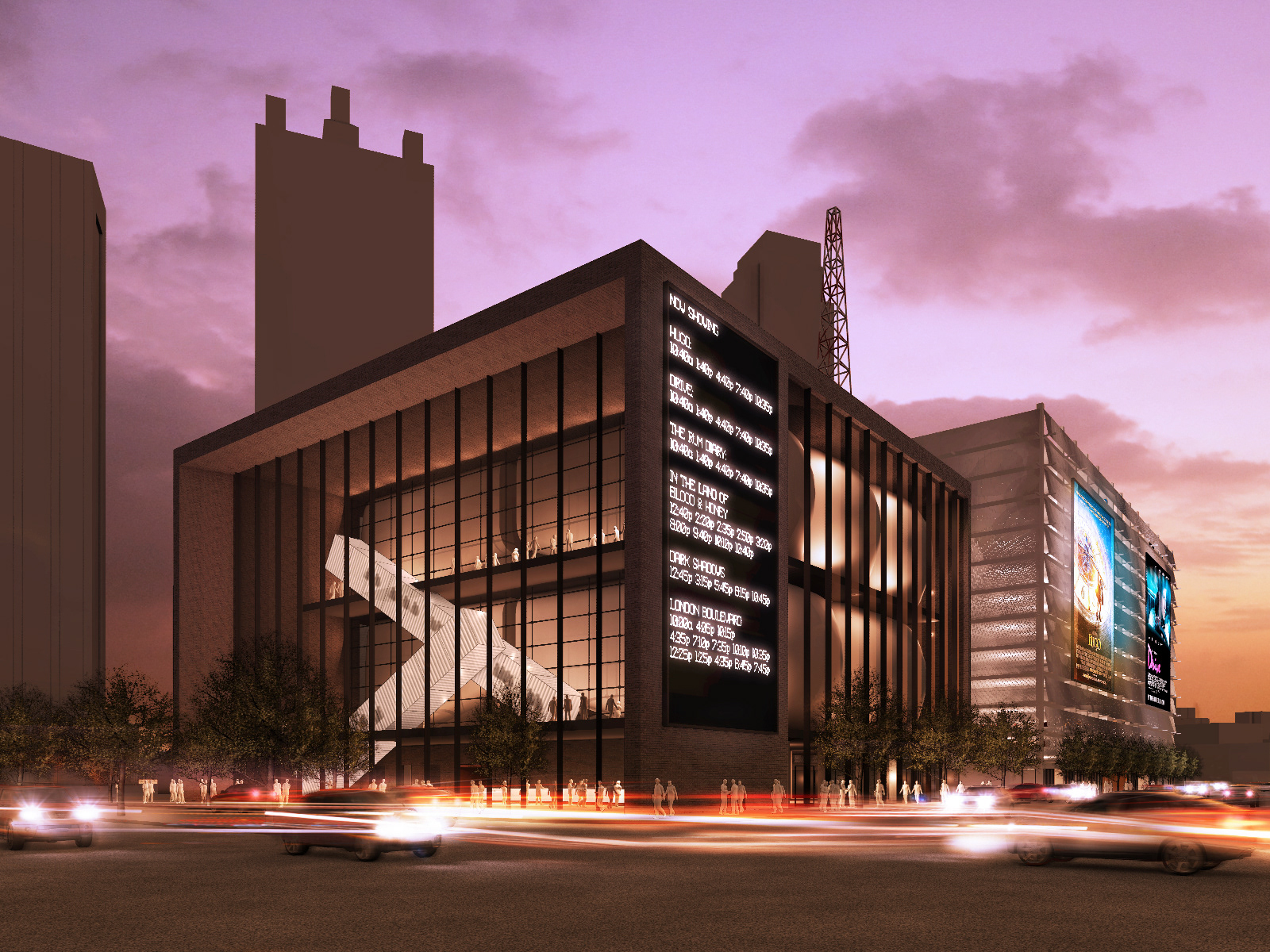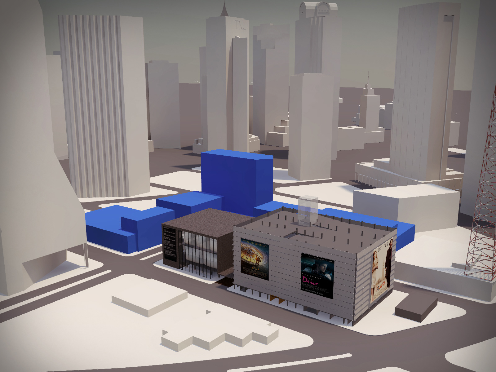 Concept for development of a potential site in Dallas, includes a new skin treatment for an existing parking garage, new Movie Theatre complex all surrounded by mixed use housing and retail.