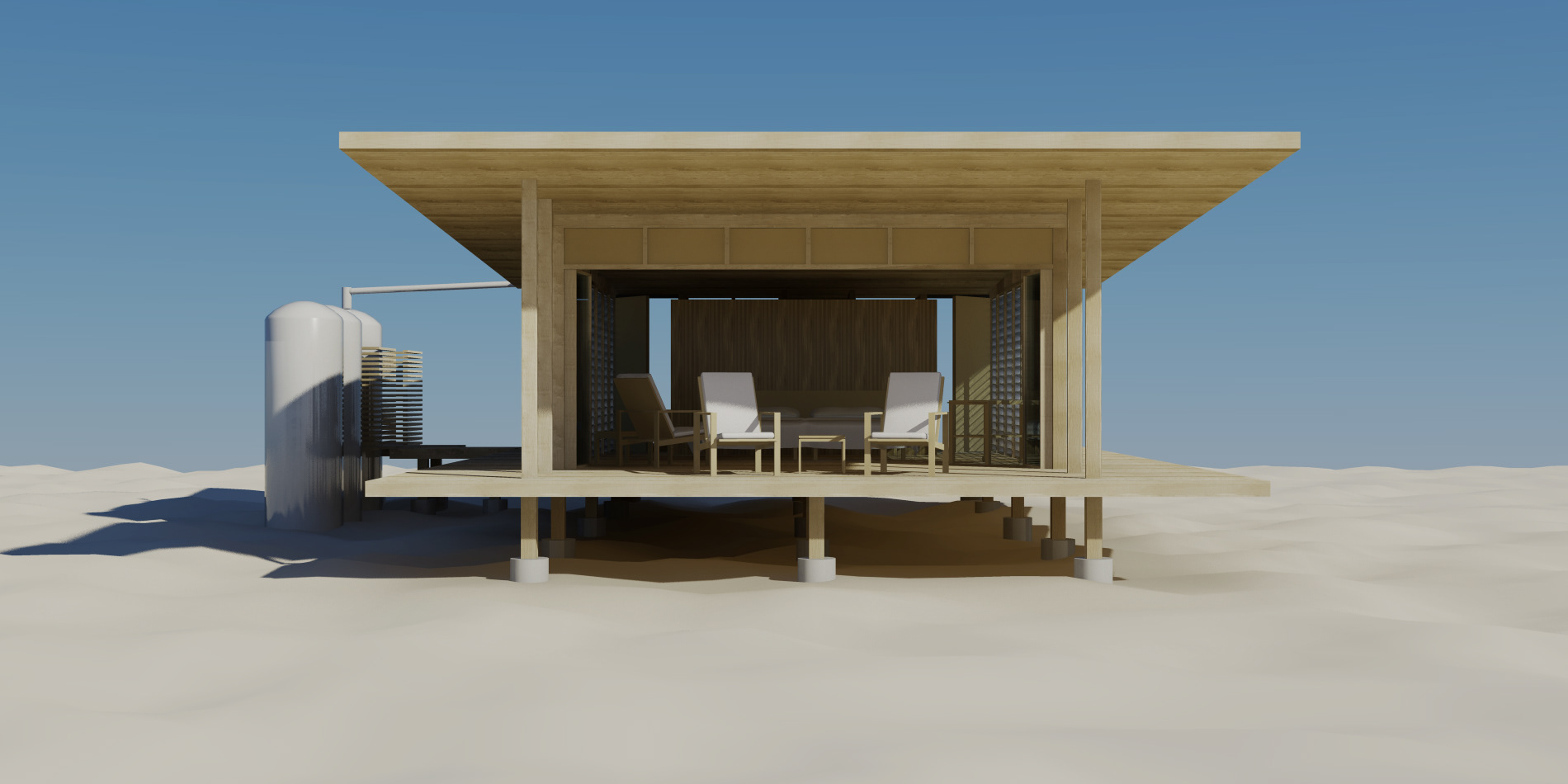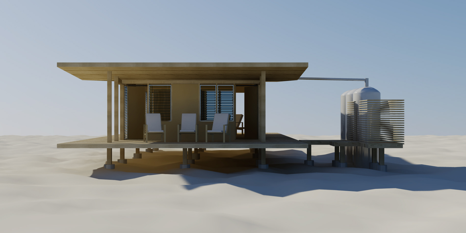 Competition concept for a sustainable, flat pack resort that can be easily transported to an island site and constructed with minimal resources and without an existing electrical or plumbing infrastructure.